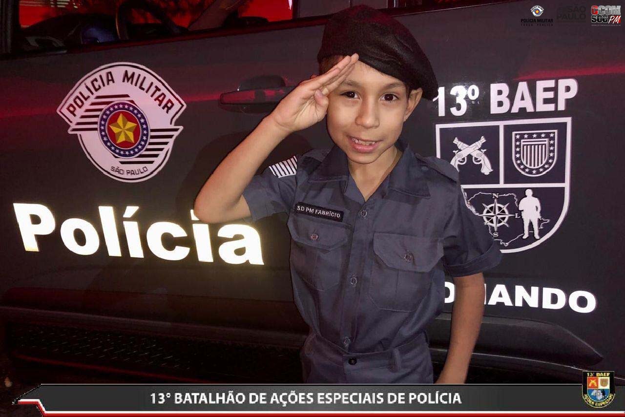 Quinta-feira (20), os policiais militares do 13º BAEP (Batalhão de Ações Especiais de Polícia), realizaram o sonho do pequeno Fabrício, que completou 8 anos naquela data.