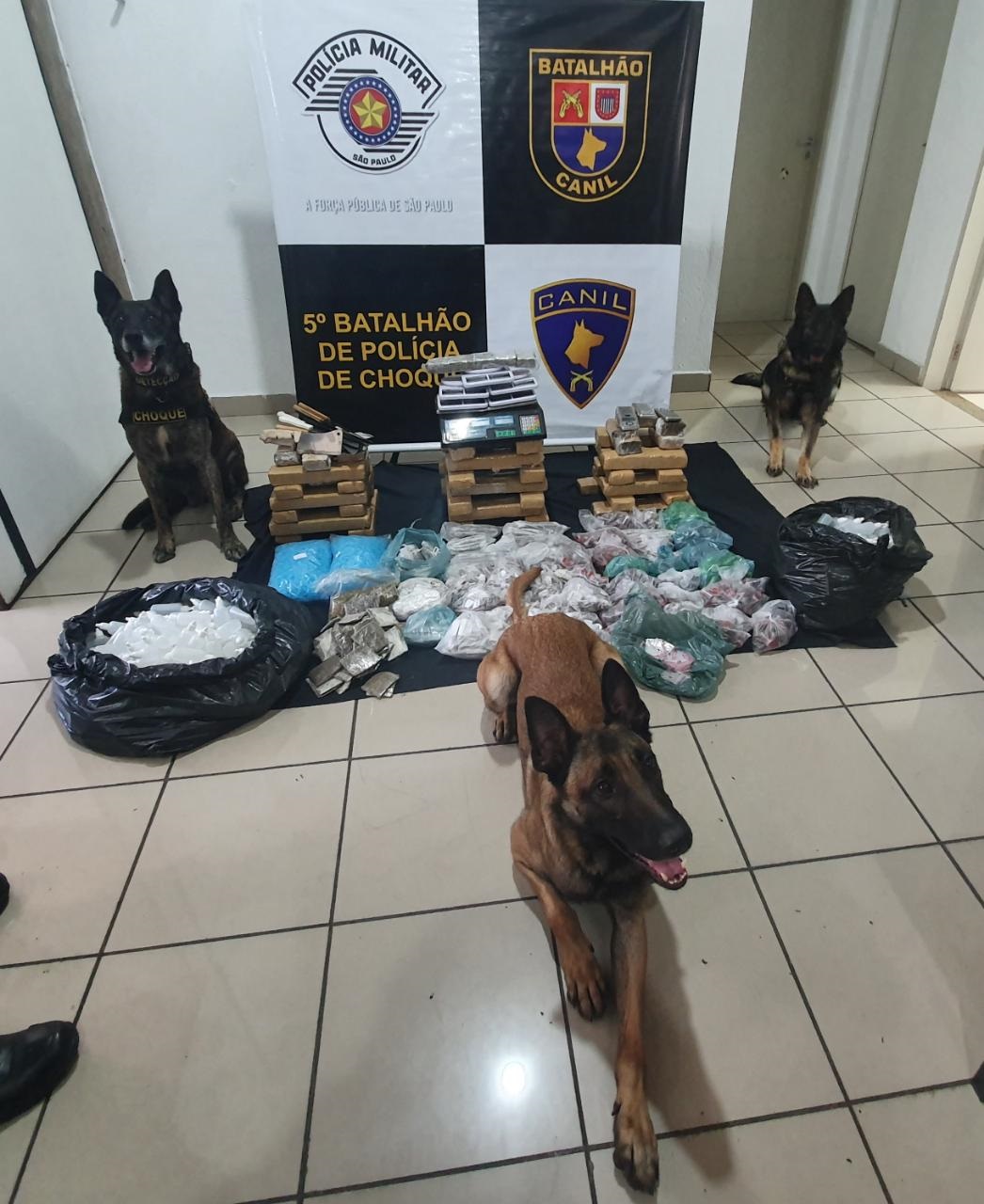 Segunda (15), os policiais militares do 5º Batalhão de Polícia de Choque, durante a operação de combate ao tráfico de drogas pela Comunidade “São Remo”, com o apoio dos cães policiais Tank, Bulma e Aruck, que indicaram odor de drogas provenientes de uma moradia inabitada, localizaram o total de:
