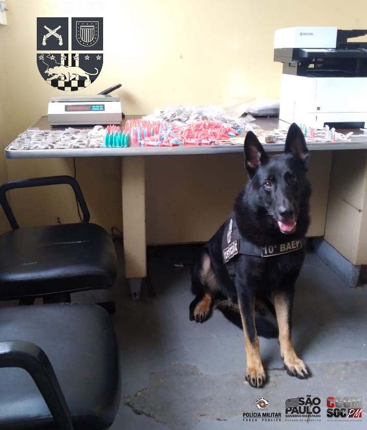 Realizado o procedimento policial militar, foi possível deter o menor infrator com uma sacola contendo 27 pedras de crack, 18 porções de maconha, 14 pinos de cocaína e R$ 345,00 em dinheiro. Indagado, confessou a comercialização, e negou dizer onde estaria o restante do ilícito. Com o apoio do cão policial Mouro, foi realizada a varredura do local, e indicou em escombros de construção, sendo localizado mais uma sacola com 59 porções de maconha, 15 pedras de crack, 92 pinos de cocaína. O cão ainda indicou um segundo local de mata, um tambor enterrado contendo 681 pinos de cocaína e 376 porções de maconha. Todas as porções tinham a mesma embalagem inclusive aquelas encontradas com o menor infrator.