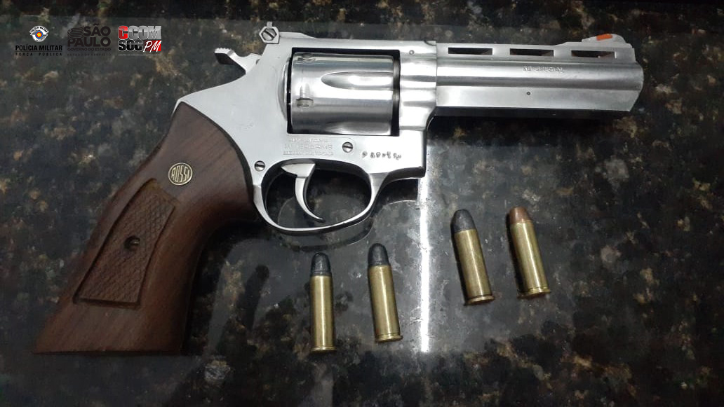 Devido à denúncia de que o autor possuía uma arma de fogo, foi feita uma vistoria no interior da residência onde foi localizado um revólver calibre 38 com a numeração suprimida e 4 munições intactas. Questionado, o indivíduo declarou que o armamento era para defesa pessoal.