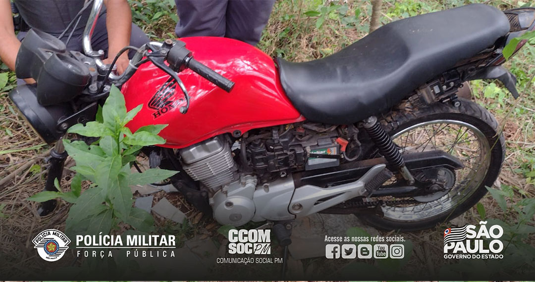 Hoje (26), policiais militares do 26º Batalhão de Polícia Militar do Interior receberam uma denúncia de que indivíduos estariam desmontando uma motocicleta em um matagal no final da Rua 43, bairros Parque das laranjeiras, município de Mogi Mirim. As equipes foram averiguar e depois de incursão localizaram a motocicleta sem a placa e a roda dianteira, feita a pesquisa pelo numeral do chassi, constou ser produto de roubo. Foi feito contato com a proprietária da residência e ela informou aos policiais que o filho chegou com a moto, mas ela não deixou que guardasse em sua casa.