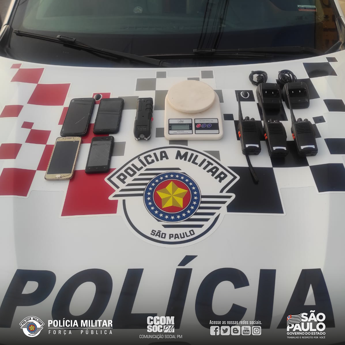No local, os policiais militares constataram 5 indivíduos, sendo dois menores, mantendo a vítima presa em um quarto pequeno da casa. Foi localizado na residência um aparelho de choque, uma balança de precisão usada para pesagem de drogas, três rádios comunicadores, dois carregadores e quatro aparelhos celulares.