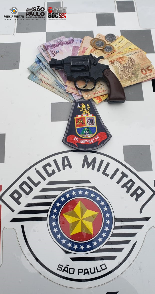 A equipe fez contato com a vítima e de posse das características do indivíduo realizou patrulhamento nas imediações e na Rua Adelino de Almeida Castilho, quando avistou o indivíduo com as características passadas pela vítima realizou abordagem e localizou um simulacro de arma de fogo (revólver) e a quantia furtada de R$ 466, 50 (quatrocentos e sessenta e seis reais e cinquenta centavos).