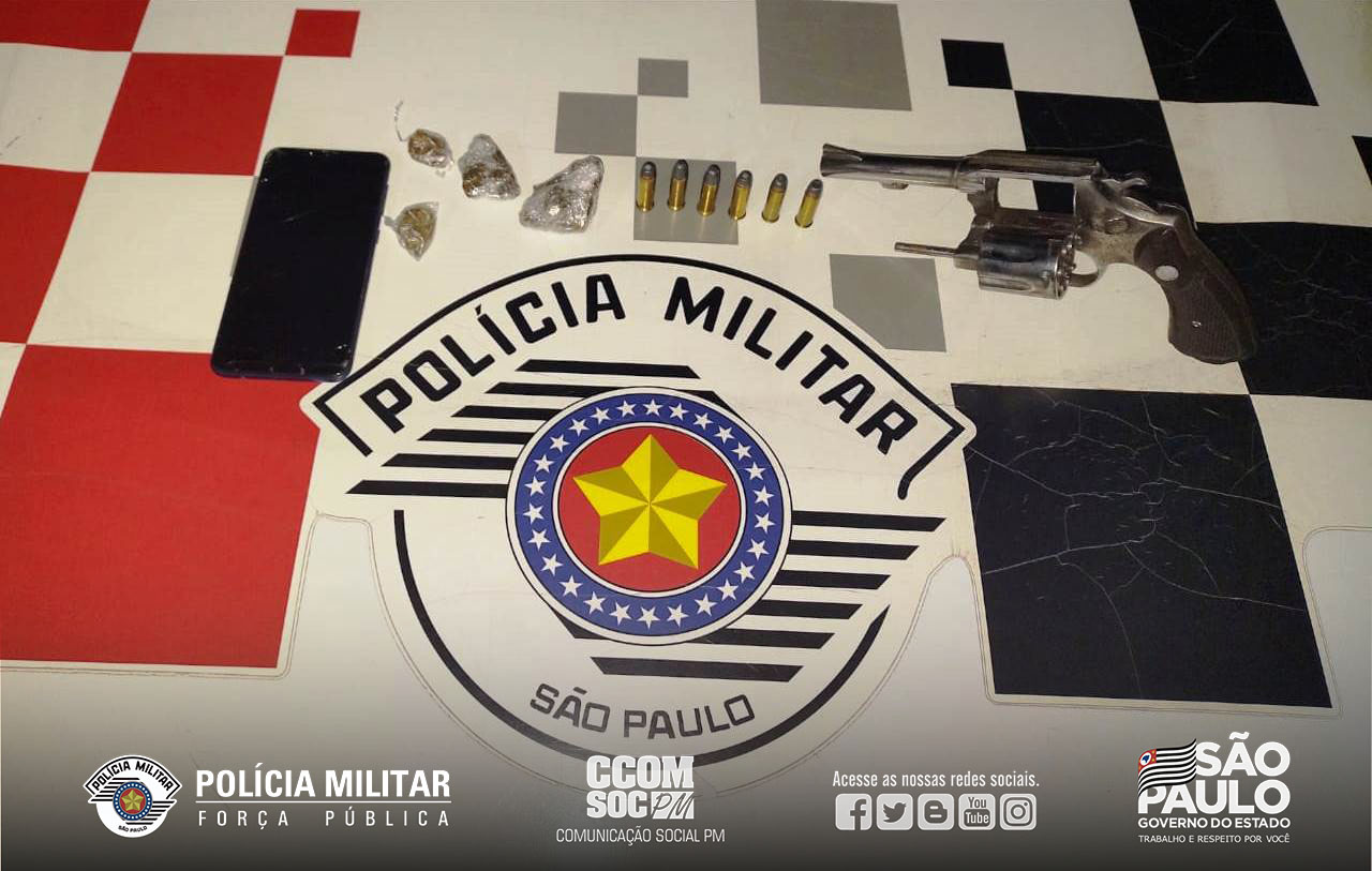 Domingo (15), policiais militares da Força Tática do 23º Batalhão de Polícia Militar do Interior estavam em patrulhamento no bairro Jardim América, Cruzeiro, quando se depararam com um indivíduo em atitude suspeita, e após abordagem e busca pessoal, foi localizado certa quantidade de entorpecente. Ao ser questionado se tinha mais entorpecente em sua residência informou que sim, sendo que ao verificar o imóvel foi localizado um revólver marca Taurus, com 06 munições intactas e 02 porções de maconha. Indagado informou que possuía a arma devido aos homicídios que estão ocorrendo na cidade. Conduzido ao plantão policial permaneceu à disposição da justiça.