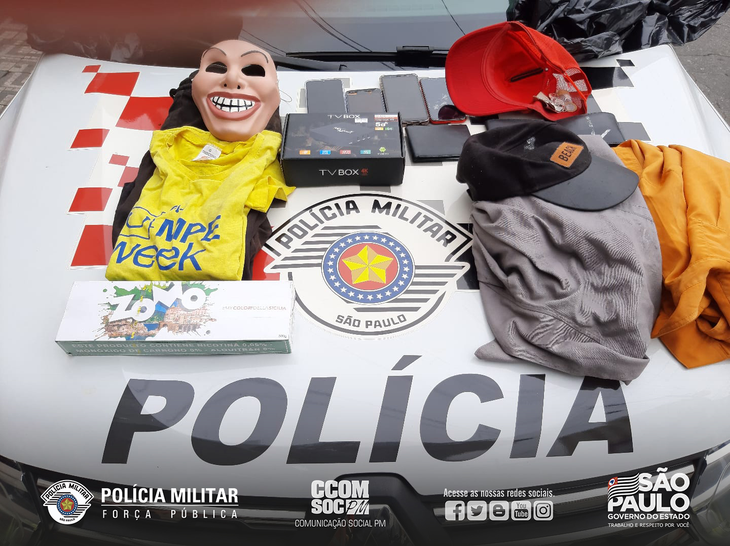 A equipe abordou os indivíduos e na busca pessoal e veicular foi localizado 1 aparelho TV Box, aparelhos celulares, roupas, bonés, uma mascara e essência de narguilé. Questionados confessaram a prática delituosa.