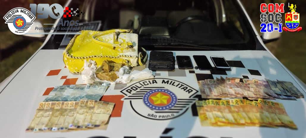 Os policiais foram até o local onde abordaram dois indivíduos e apreenderam o R$ 1.598,00 e um celular. Os criminosos levaram os policiais até outro endereço onde estavam escondidas as drogas. No local, outras duas pessoas foram presas e também foram apreendidas porções de cocaína, crack, embalagens e uma balança.