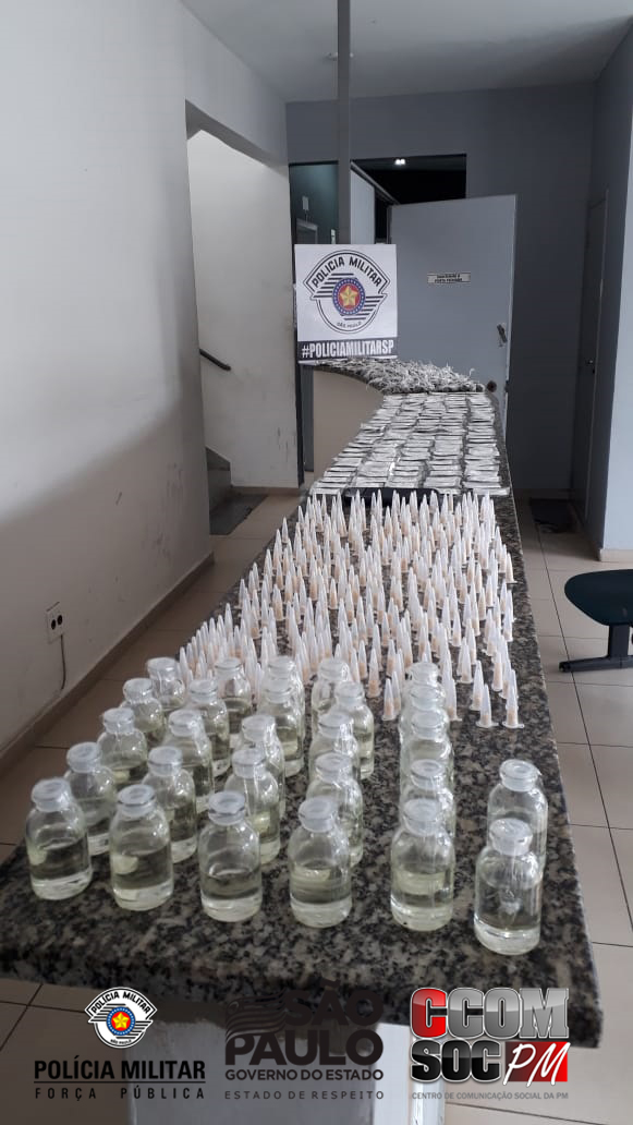Durante a busca pessoal foi localizado na mochila do suspeito 27 frascos de “lança perfume”, 351 invólucros com crack, 140 invólucros com cocaína e 322 invólucros contendo maconha.