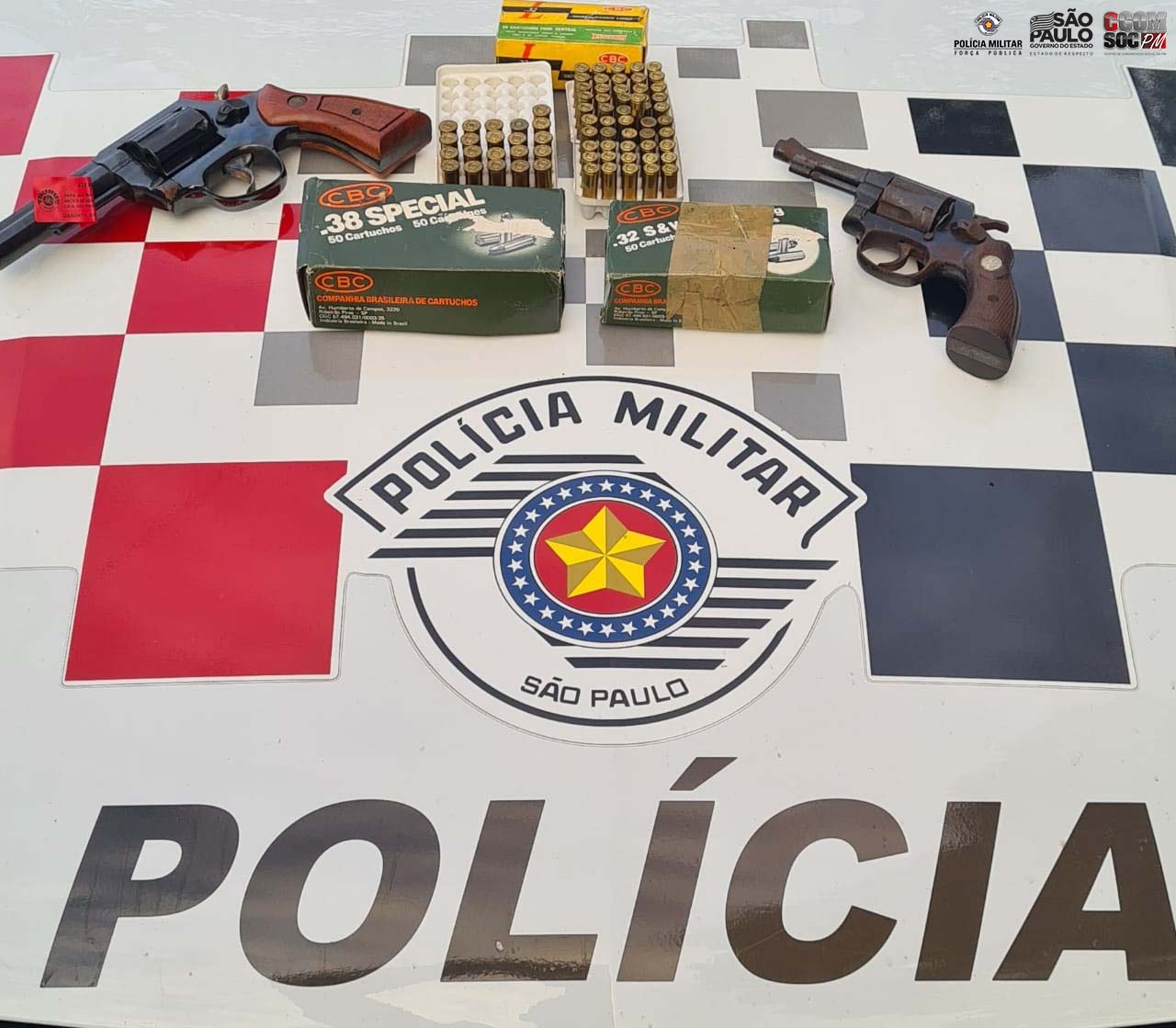 No endereço indicado, foi feito contato com o comparador dos ilícitos, que confirmou a versão, e autorizou a entrada da equipe no local onde as baterias estavam armazenadas. Durante a entrada no local, os policiais puderam ver diversas munições de arma de fogo, o indivíduo declarou que teria também duas armas de fogo, uma de calibre 38 e 32.