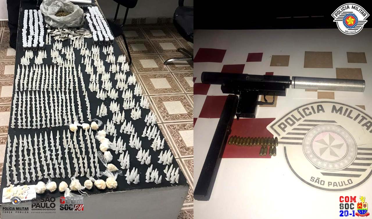 Realizada a abordagem, foi localizado com o indivíduo porções de drogas e uma submetralhadora calibre 9mm, com silenciador e 18 munições intactas.