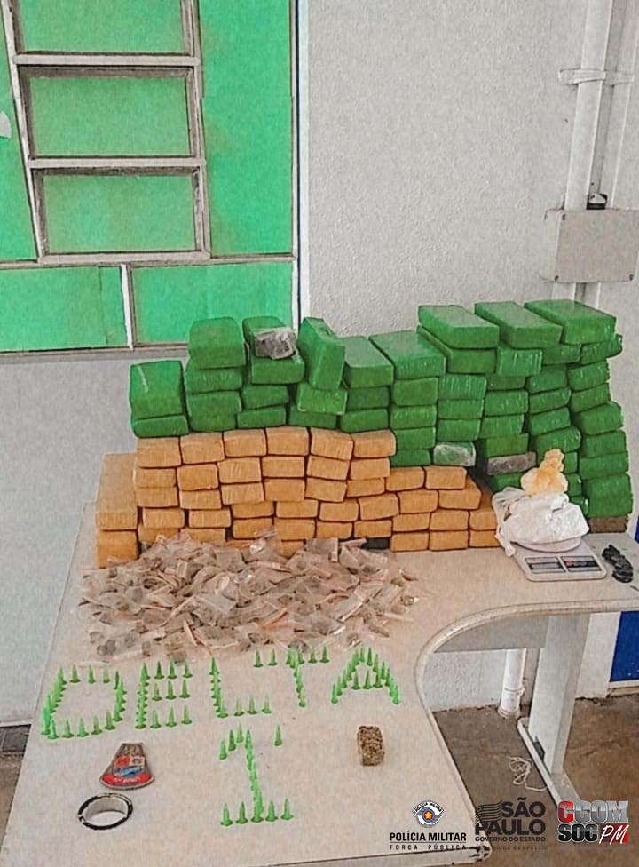 No local, foi localizado o total de: 178 papelotes e 104 kg de maconha em tijolos, 93 recipientes de crack, e um saco com 0,485kg de cocaína.