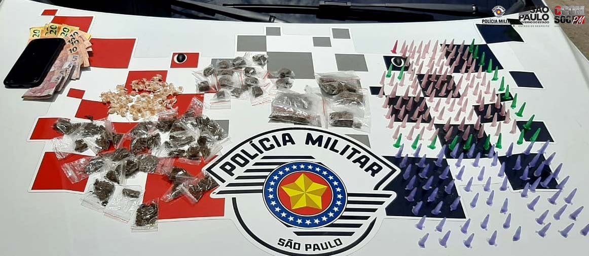 Realizada a abordagem, foi localizado o total de: 88 pedras de crack, 47 porções de maconha, 183 pinos de cocaína e R$ 140,00 em dinheiro.