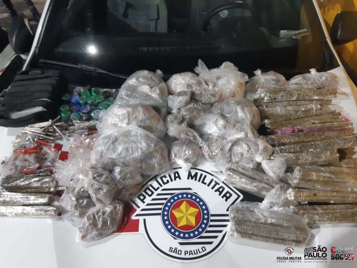 Com o indiciado foi localizado uma bolsa com 289 porções de crack, 24 micro tubos e 19 porções maiores de maconha, 15 pinos de cocaína e R$ 172,75 em dinheiro, além de um celular.