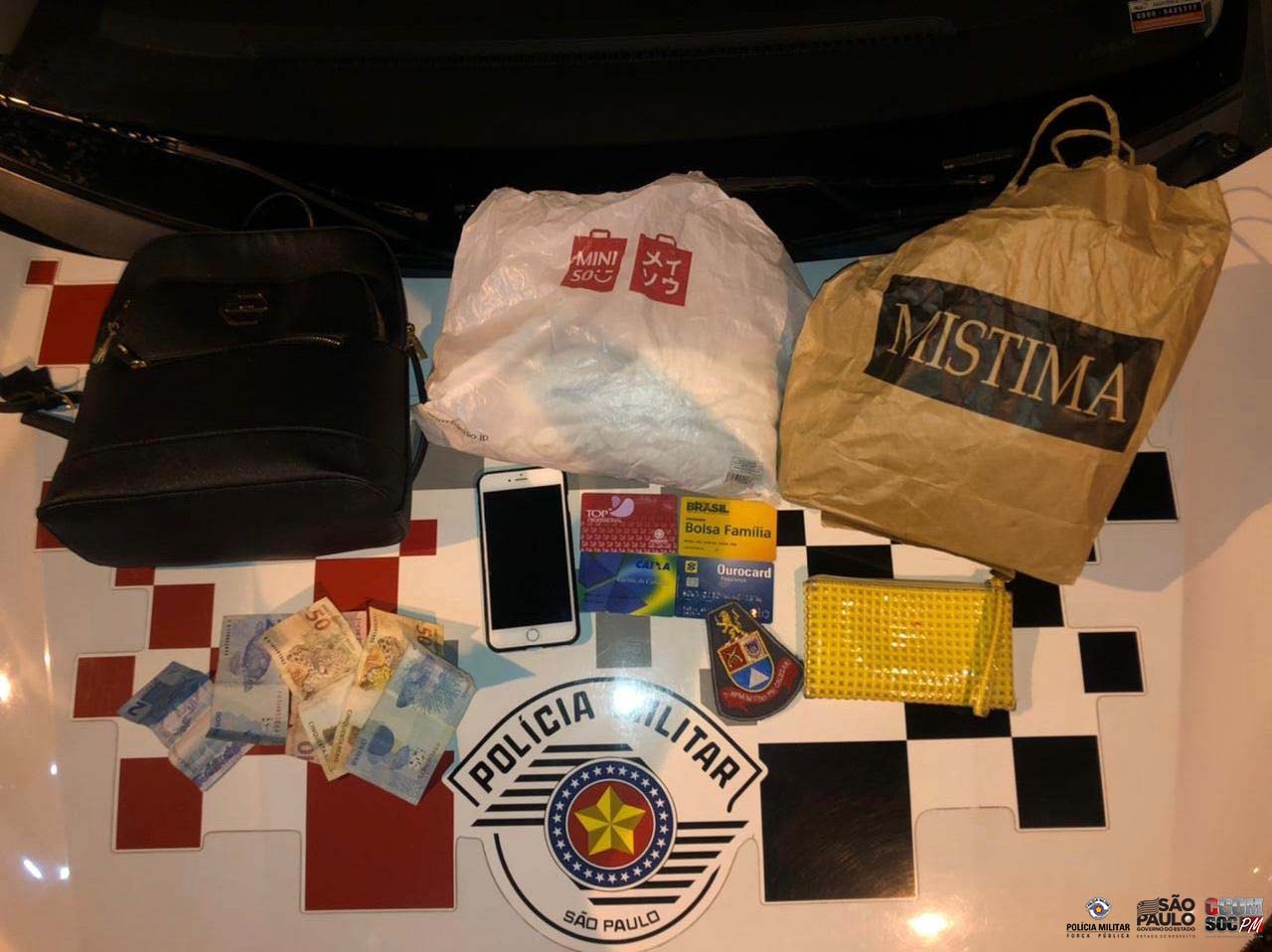 Próximo a Rua da Glória, foram localizadas quatro suspeitas semelhantes às características descritas. Realizada a abordagem foi localizada uma bolsa com os pertences da vítima, sendo recuperado, o celular, dinheiro, cartões e mais duas sacolas com o restante dos bens subtraídos.