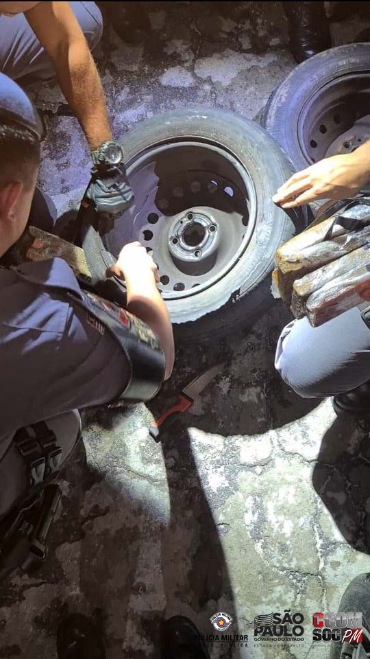 O pneu foi cortado, e dentro foram localizados 12 tijolos de maconha.