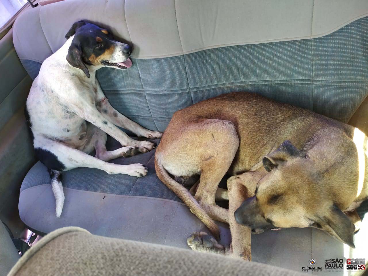 Imediatamente realizaram patrulhamento com vistas aos dados comunicados e em poucos minutos foi localizado o veículo. Realizada a abordagem, no banco de traseiro do veículo foram localizadas duas espingardas calibre 28, cinco munições intactas e uma deflagrada. Ainda durante a busca, no porta malas do veículo, foram localizados dois cães amarrados, com diversos ferimentos graves, um deles estava desacordado devido as condições.