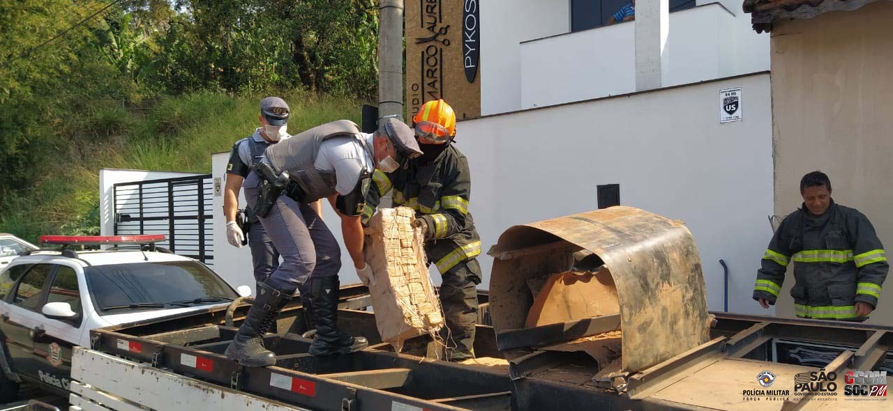 Os cães policiais indicaram odor de drogas na carroceria, sendo necessário que os bombeiros fizessem um corte no assoalho.