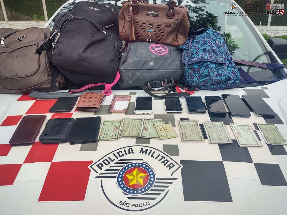 Com o indiciado foram localizados seis celulares, cinco carteiras, cinco mochilas e 1 bolsa. Foi verificado também que a motocicleta utilizada era produto de roubo.