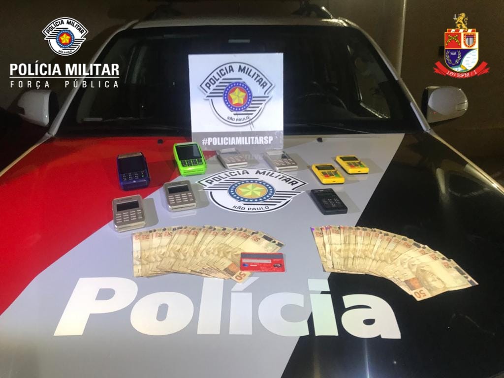 Realizada a abordagem, com esse indivíduo foram encontradas várias máquinas de cartão, aproximadamente R$ 3.100.00 em dinheiro além de vários cartões de outras vítimas.