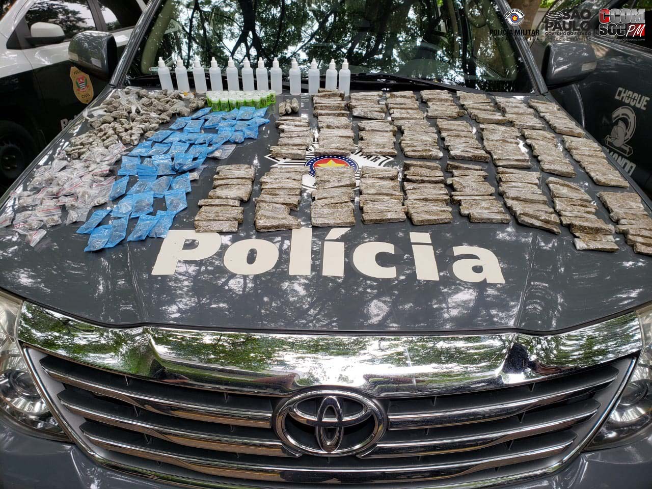 Domingo (4), os policiais militares do 2º Batalhão de Polícia de Choque, em patrulhamento ela Rua Pedro Faber, área do 16º Batalhão de Polícia Militar Metropolitano, abordaram um indivíduo em atitude suspeita, sendo localizadas no bolso da blusa algumas porções de drogas. Indagado, confessou que comercializava entorpecentes e indicou o local onde guardava o restante a ser comercializado. Em diligência foi localizado uma mala contendo grande quantidade de maconha e lança perfume.