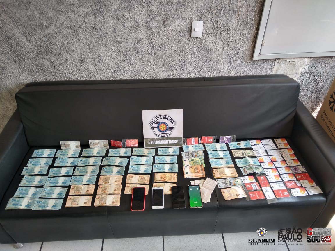 Após a localização dos veículos, foi realizada a abordagem. No primeiro veículo, ocupado por três indivíduos, foi localizada quantia de R$ 3.300,000 (Três mil e trezentos) reais, U$ 400,00 (quatrocentos) dólares, e 150 (cento e cinquenta) euros: com José Thiago a quantia de R$ 1.317,00 (mil trezentos e dezessete reais) e 100 (cem) dólares, com o primeiro abordado. Com o segundo indivíduo foram localizados R$ 1.317,00 (mil trezentos e dezessete reais) e 100 (cem) dólares, e com o terceiro R$ 481,00 (quatrocentos e oitenta e um) reais e U$ 02,00 (dois) dólares.