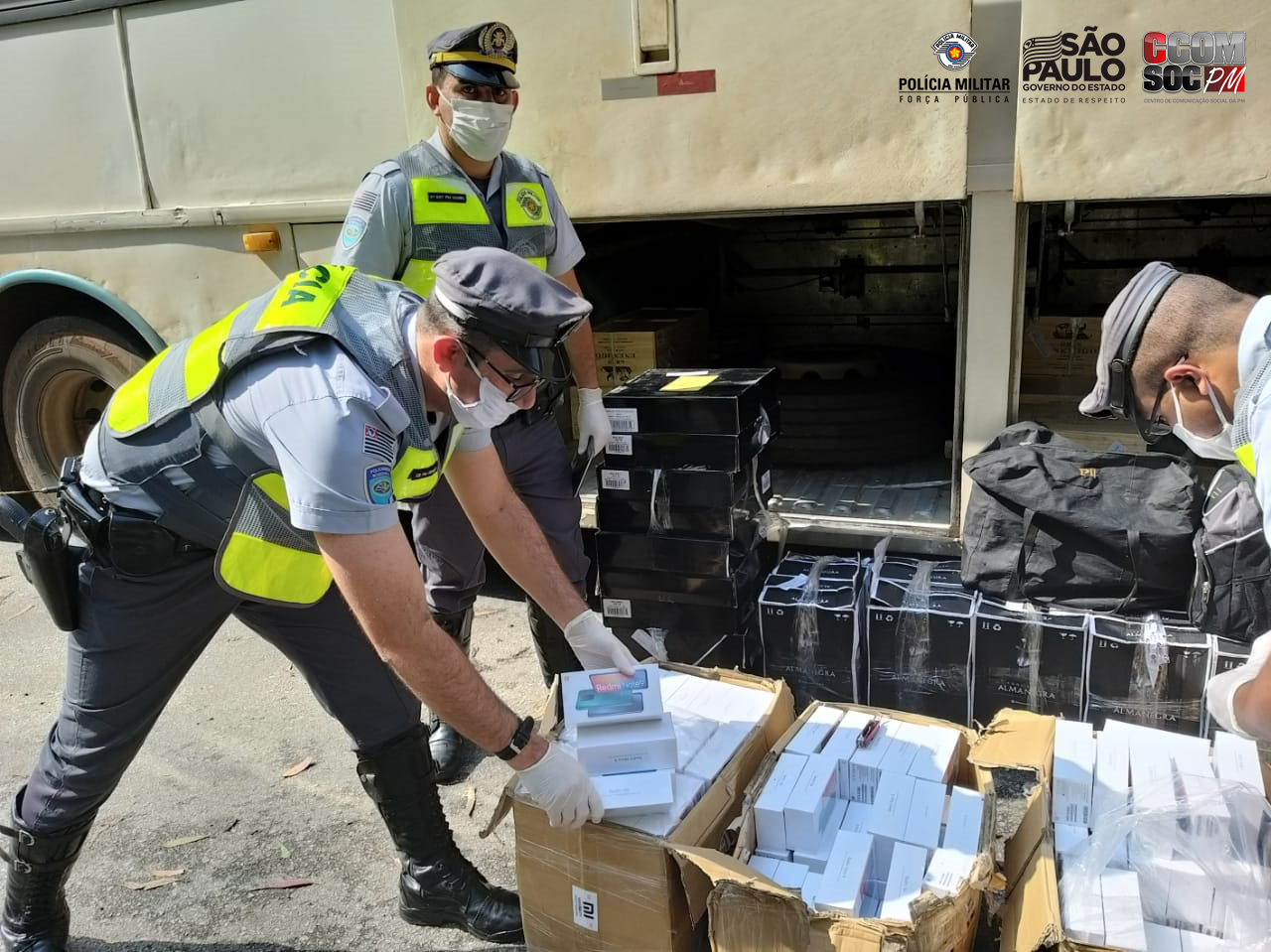 Durante patrulhamento pela SP 270 Rodovia Raposo Tavares, Km 36 Pista leste – Cotia, a equipe suspeitou de um ônibus, realizando a abordagem. O veículo teria como origem a cidade de Foz do Iguaçu x São Paulo, transportava 06 passageiros. Durante entrevista com o condutor, foi informado que havia no veículo grande quantidade de mercadorias oriundas do Paraguai, provenientes de descaminho. Diante dos fatos a equipe conduziu o veículo até a Base Operacional, para uma busca minuciosa e com ajuda dos agentes da Receita Federal, juntamente com apoio de um cão farejador em vistoria ao ônibus encontraram: