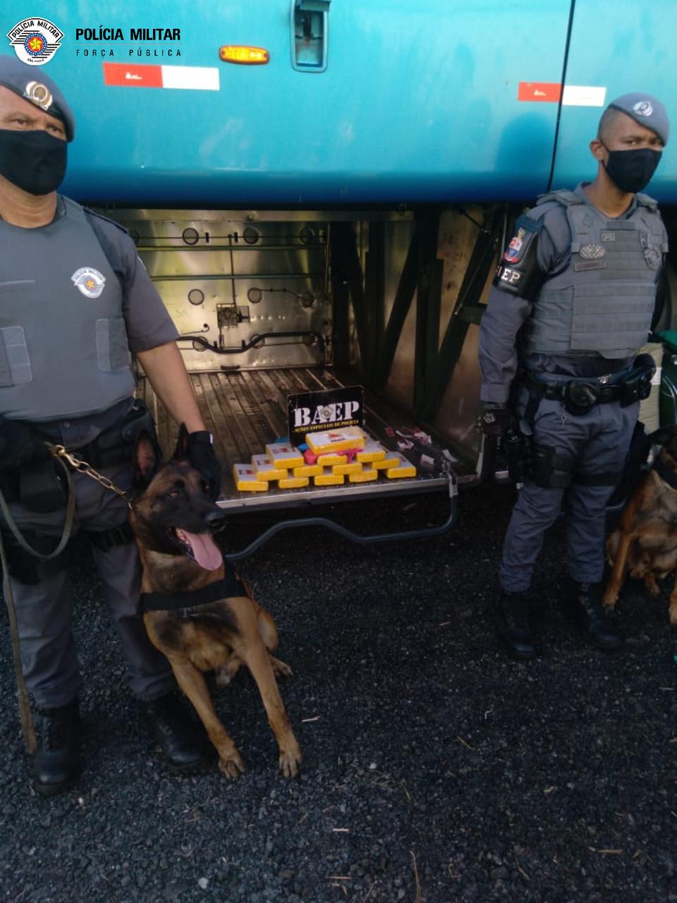 Sexta Feira (19), policiais militares do 1º Batalhão de Ações Especiais de Polícia  e Policiais Rodoviários Federais, estavam pela Rodovia Fernão Dias, Atibaia, onde abordaram um ônibus com destino a Belo Horizonte. Durante a busca veicular, no interior do bagageiro,  com a ajuda do cão Hatch, inserido na patrulha foi localizar uma mala suspeita, e após o proprietário fornecer a senha da mala foram localizados 12 tabletes de pasta base de cocaína, avaliado em aproximadamente R$ 1.500,000,00 (um milhão e quinhentos mil reais). A ocorrência foi apresentada da Delegacia de Polícia, onde o criminoso permaneceu à disposição da Justiça.