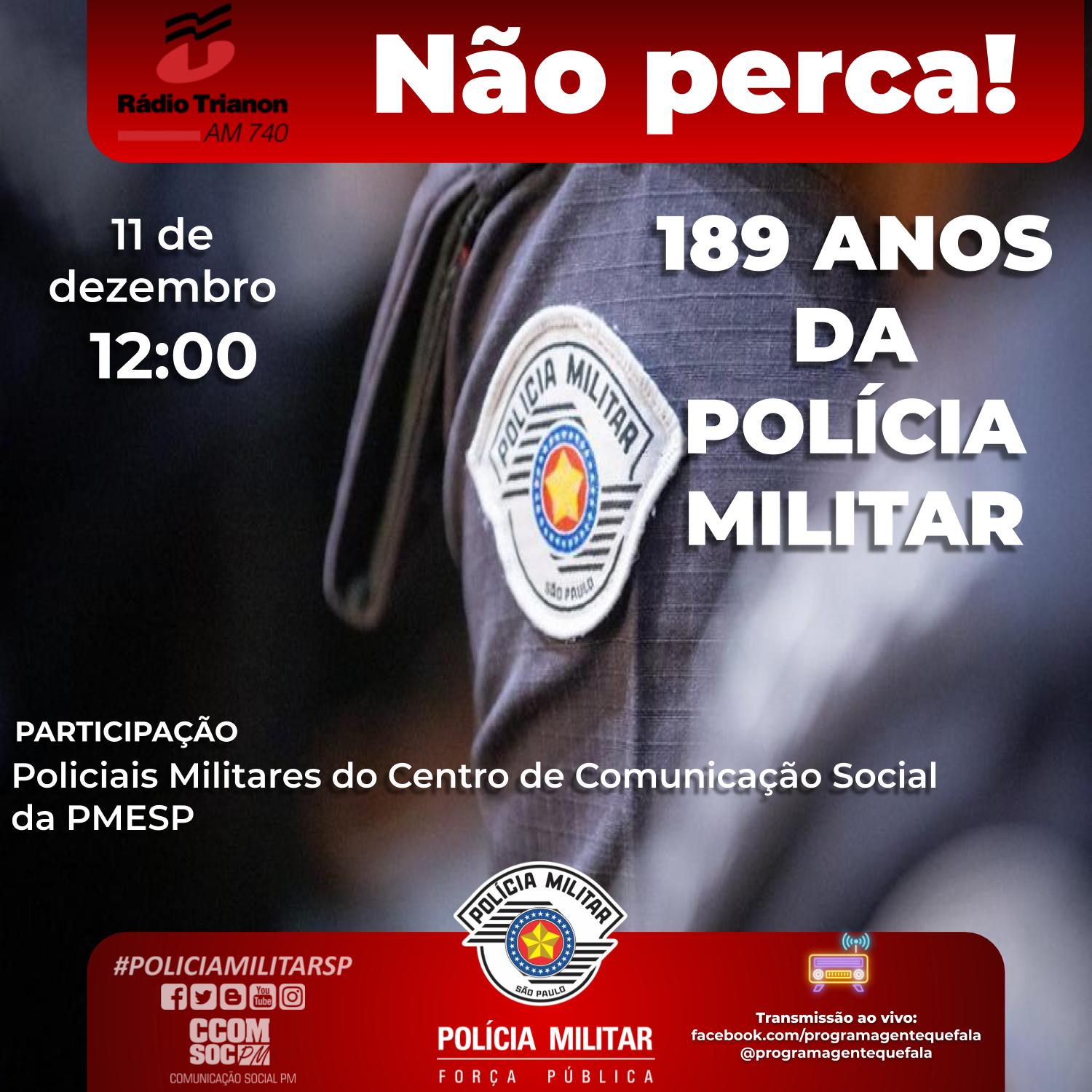 Nesta sexta-feira (11), na Rádio Trianon AM 740, às 12h00, os policiais militares do CComSoc – Centro de Comunicação Social da Polícia Militar falarão sobre 189 anos da Polícia Militar.