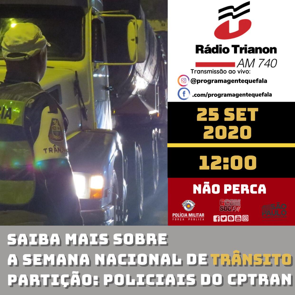 Sexta-feira (25), na Rádio Trianon AM 740, às 12h00 policiais militares do CPtran – Comando de Policiamento de Trânsito, falarão sobre  a Semana Nacional de Trânsito.
