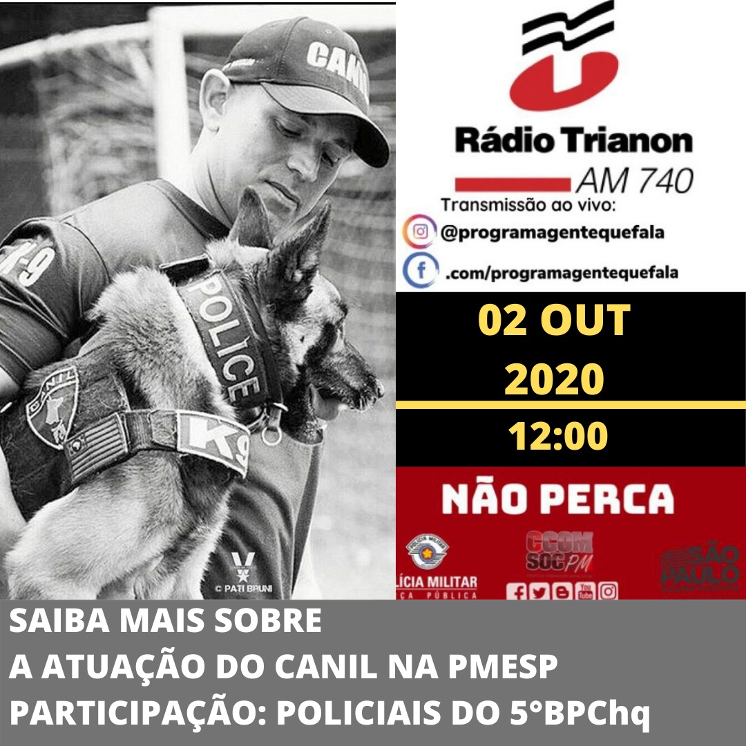 Nesta sexta-feira (02), na Rádio Trianon AM 740, às 12h00, os policiais militares do 5° Batalhão de Polícia de Choque falarão sobre a atuação do Canil na PMESP.