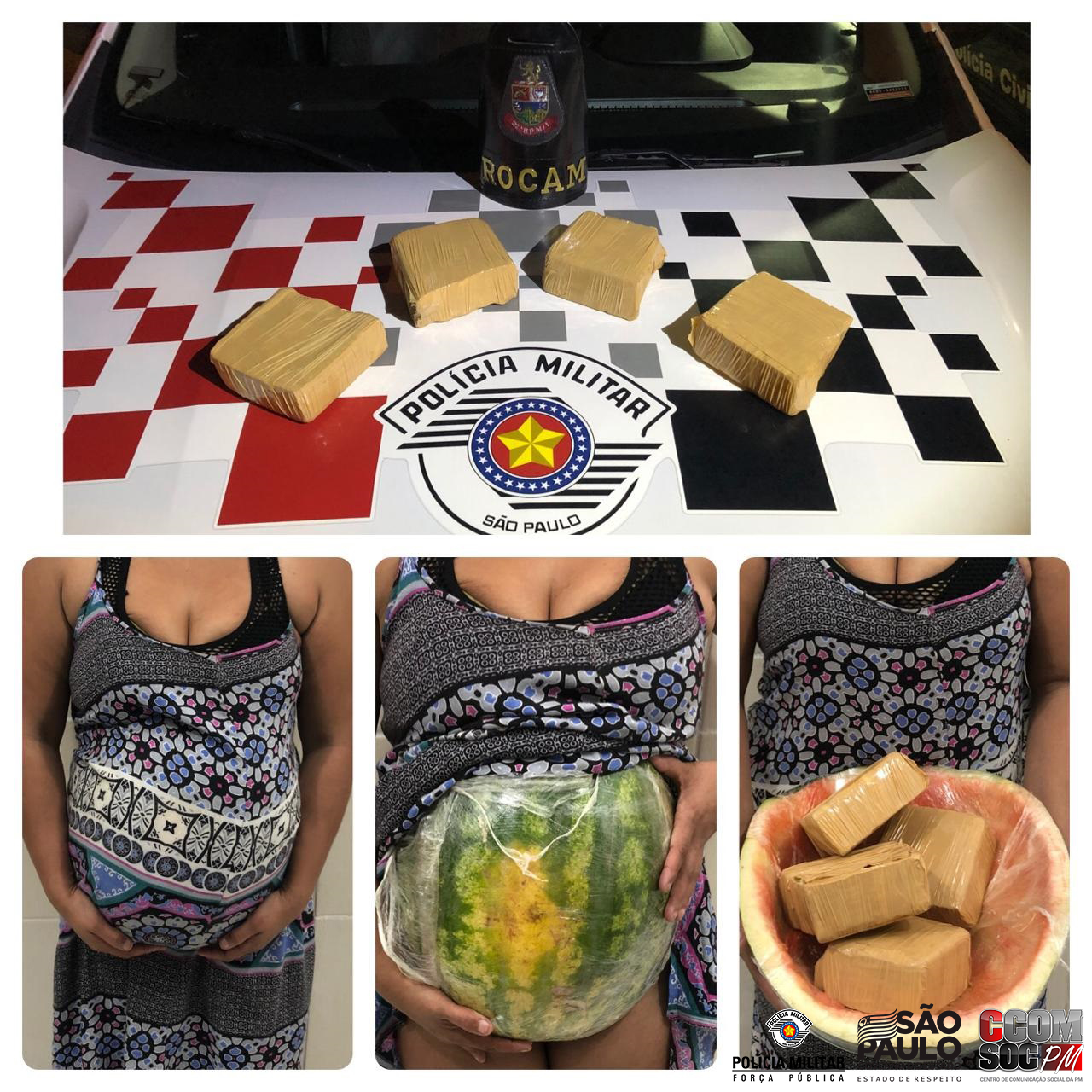 A equipe ROCAM (Rondas Ostensivas com Apoio de Motocicletas) recebeu uma denúncia de que uma mulher estava transportando drogas dentro de um ônibus com destino ao Rio de Janeiro. Durante as averiguações, suspeitaram de uma mulher que dizia estar grávida. Durante a busca pessoal, para a surpresa da equipe, a barriga era falsa. Foi localizado uma melancia contendo 4 tijolos de pasta base de cocaína, aproximadamente 2kg.