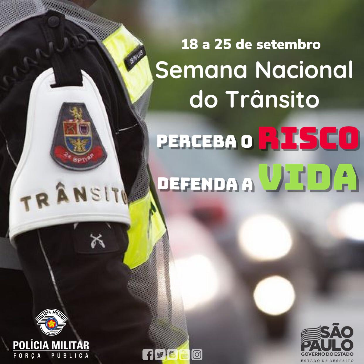 Inicia-se hoje (18), a Semana Nacional de Trânsito, comemorada entre os dias 18 a 25 de setembro e o Comando de Policiamento de Trânsito realizará atividades voltadas à área de fiscalização e educação para o trânsito com a Campanha “PERCEBA O RISCO, PROTEJA A VIDA”.