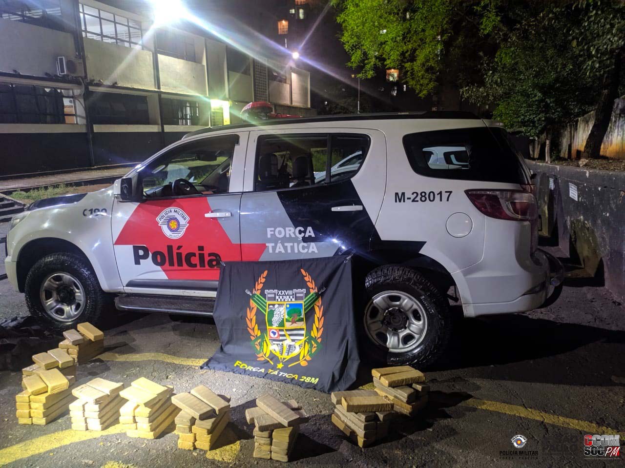 Realizada a abordagem, inicialmente nada de ilícito foi localizado com o casal, porém, feita a busca veicular, foi encontrada 3 bolsas de viagem contendo 91 tijolos de maconha.