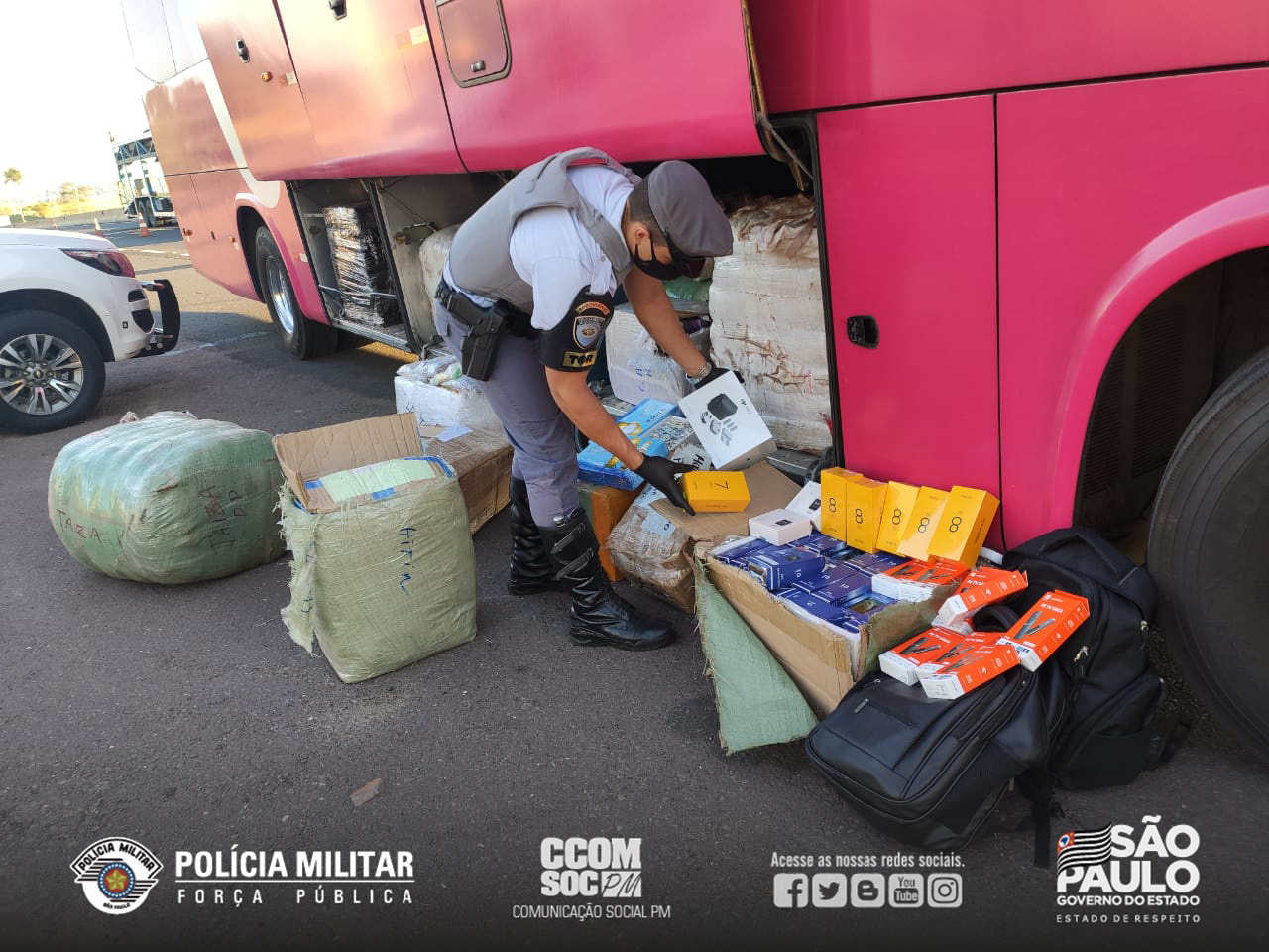 Quinta-feira (03), policiais militares do 2º Batalhão de Polícia Rodoviária, durante “Operação São Paulo Mais Seguro” em Presidente Venceslau, abordaram um Ônibus e durante fiscalização foi localizado no interior do veículo e no bagageiro externo, uma grande quantidade de mercadorias de origem estrangeira desprovido de documentação fiscal, dentre elas, relógios, roupas, cigarros, eletrônicos, telefones e acessórios de telefone, baterias, drones e essência de narguilé.