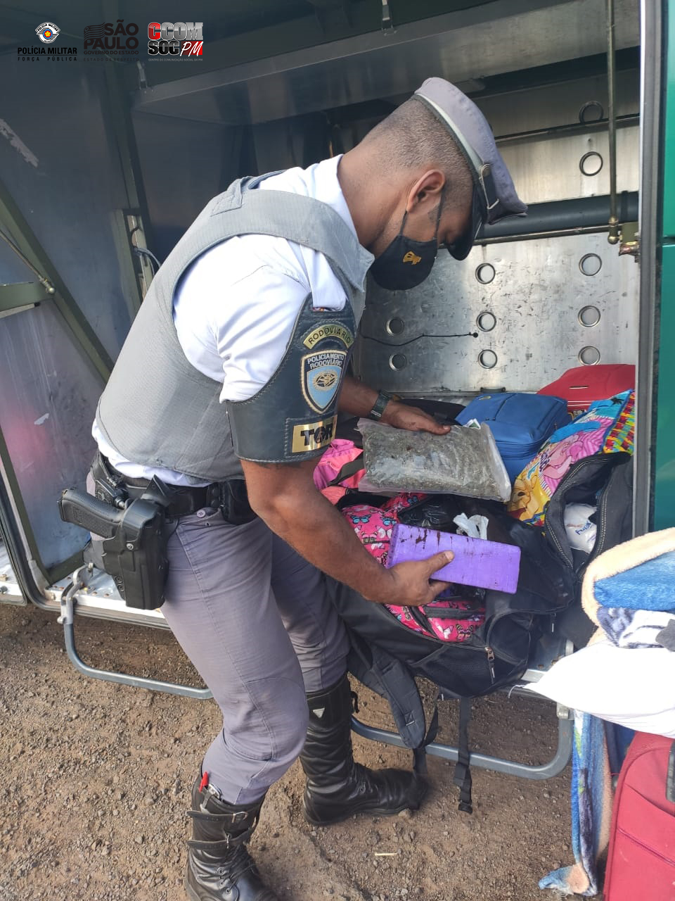 Durante desenvolvimento de ações ao combate de ilícitos administrativos e penais, a equipe TOR (Tático Ostensivo Rodoviário) abordou um ônibus de itinerário Campo Grande/MS a São Paulo/SP. Após buscas no bagageiro foram localizados 12 tabletes de maconha e 3 pacotes de skank com um passageira.