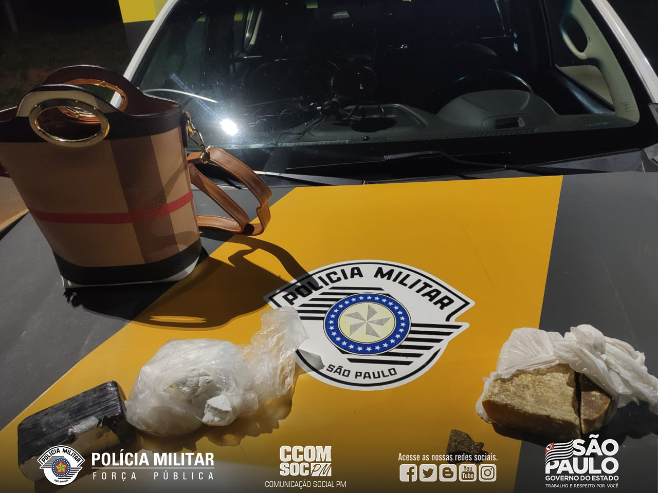 Na madrugada de sábado (03), durante o desenvolvimento da Operação Paz e Proteção, a equipe do TOR – Tático Ostensivo Rodoviário do 2º Batalhão de Polícia Rodoviária, abordou um ônibus de linha interestadual e durante fiscalização foi localizado na bolsa de mão de uma passageira 02 (dois) tabletes de Crack, 01 (um) tablete e 01 (um) pacote da droga Cocaína e 01 (uma) porção de maconha. A ocorrência foi encaminhada a Delegacia de Polícia Civil de Presidente Venceslau. A mulher foi presa em flagrante e foram apreendidos um total de 0,480 (quatrocentos e oitenta) gramas de Crack, 0,630 (seiscentos e trinta) gramas de Cocaína e 0,005 (cinco) gramas de maconha.