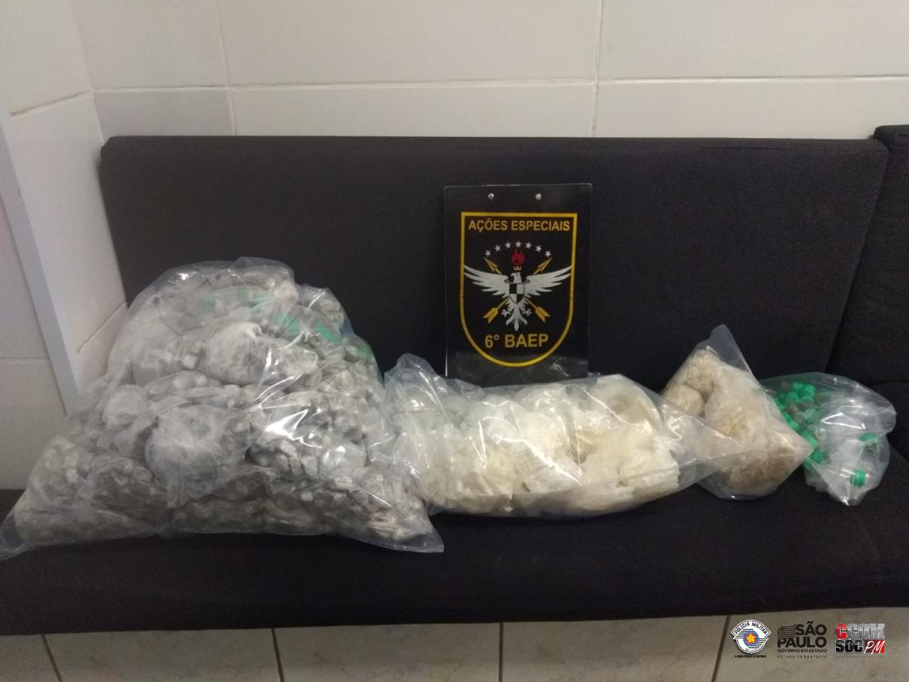 Domingo (13), policiais militares do 6º BAEP – Batalhão de Ações Especiais de Polícia em patrulhamento pela Rua: Carajás Filho, Vila São José, em São Bernardo do Campo, abordaram um homem, e durante a busca pessoal localizaram em uma mochila 3.000 porções maconha, 1.015 porções de cocaína, 738 porções de crack, 38 porções de Skunk, R$ 148,00. O criminoso foi levado para o 1º Distrito Polícia, onde permaneceu à disposição da Justiça.