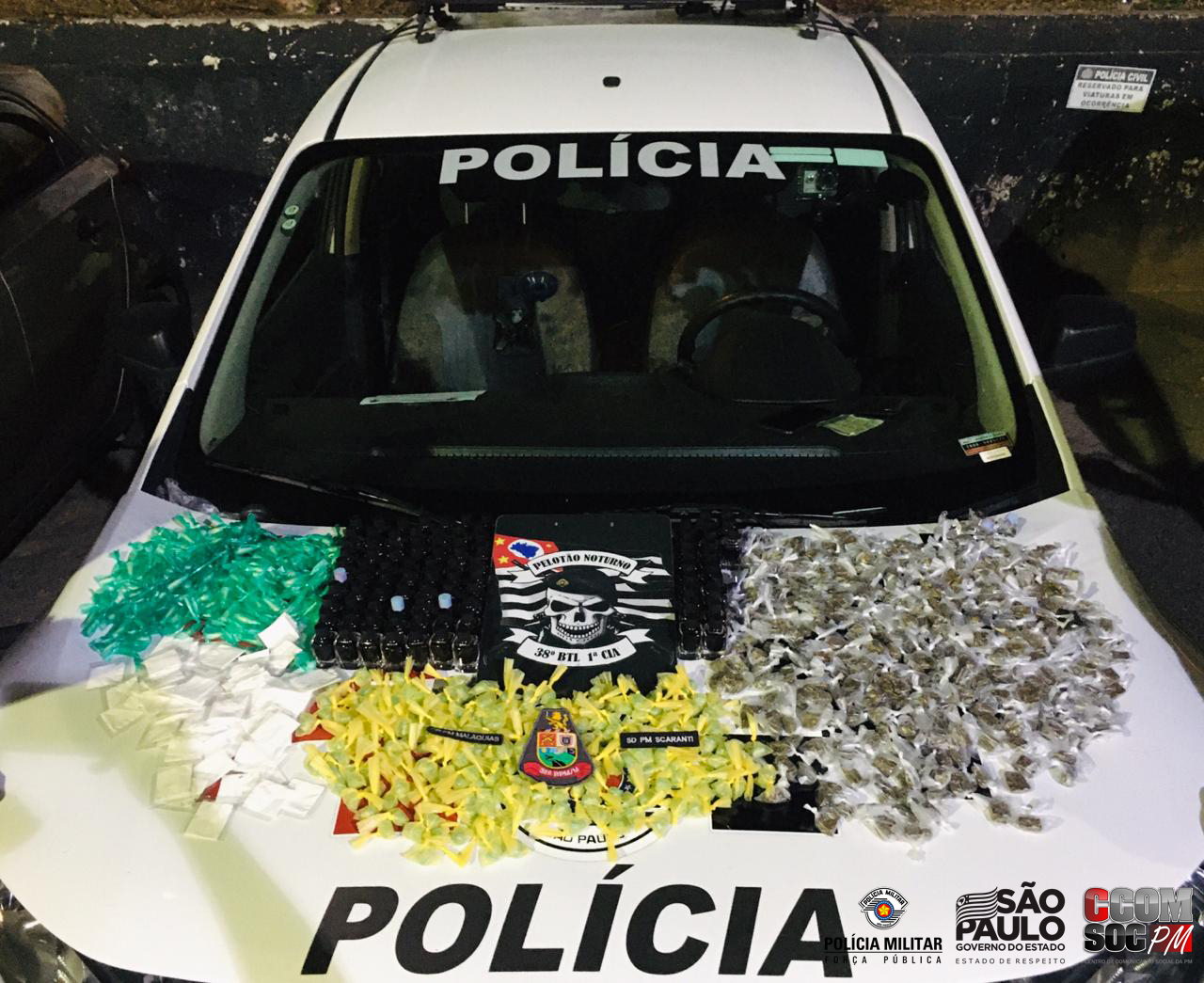 Na abordagem e vistoria as sacolas que o abordado arremessou pela janela, os policiais constaram certa quantidade de drogas (maconha, pinos, crack, cocaína e lança perfume). O traficante preso que já possuía várias passagens criminais, foi encaminhado ao 49° Distrito Policial onde permaneceu à disposição da Justiça.