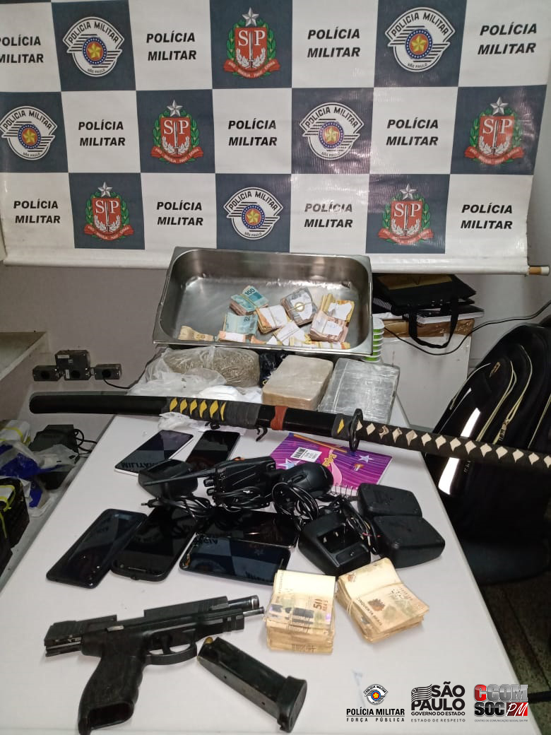 Com o infrator foi localizado e apreendido R$ 33.608,00, 70 chips para uso em fraudes contra o FGTS, 6 smartphones, 1 notebook, 6 cadernos de anotações da fraude contra o fundo de garantia, 1,05kg de cocaína, 1,0kg crack, 465g maconha a granel e 200g de pó branco para mistura. O infrator ainda era procurado por condenação pela prática de roubo na Rodovia Anchieta.