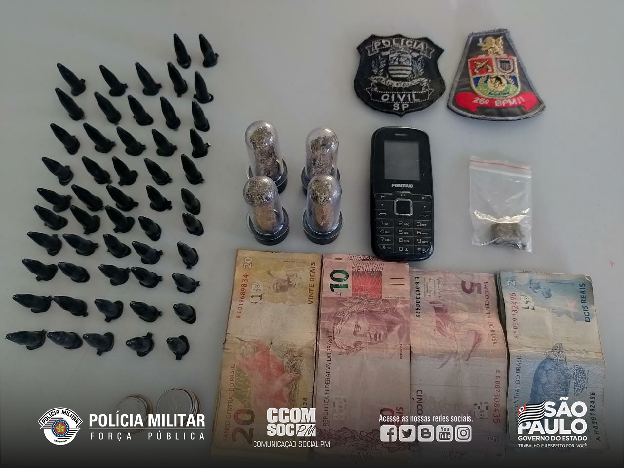 Durante uma operação conjunta com a Polícia Civil, os policiais realizaram um cerco a fim de deter alguns traficantes em uma região de mata. Os criminosos tentaram fugir, mas acabaram detidos. Com os dois presos foram encontrados R$ 377,50, 55 pinos de cocaína e porções de maconha.