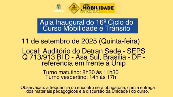 (Brasília – 10/9/2025) – Nesta quinta-feira (11), o Departamento de Trânsito do Distrito Federal realizará a aula inaugural da 16ª edição do Curso Mobilidade e Trânsito, no auditório da unidade da 913 Sul em dois horários: das 8h30 às 11h, para cursistas do turno matutino; e das 14h às 17h, para os do vespertino.